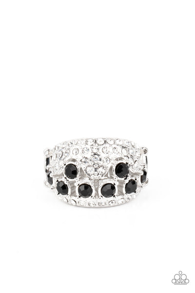 Encased in sleek silver fittings, a cluster of glittery black rhinestones coalesce inside an airy silver band encrusted in haphazard sections of glassy white rhinestones for a modern fashion. Features a stretchy band for a flexible fit.