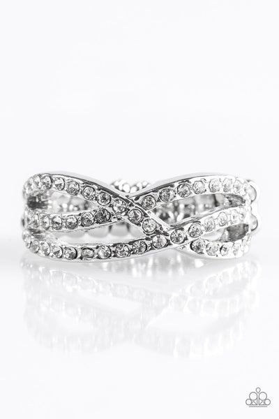 Encrusted in glittery white rhinestones, shimmery ribbons of silver crisscross across the finger in a timeless fashion. Features a dainty stretchy band for a flexible fit.