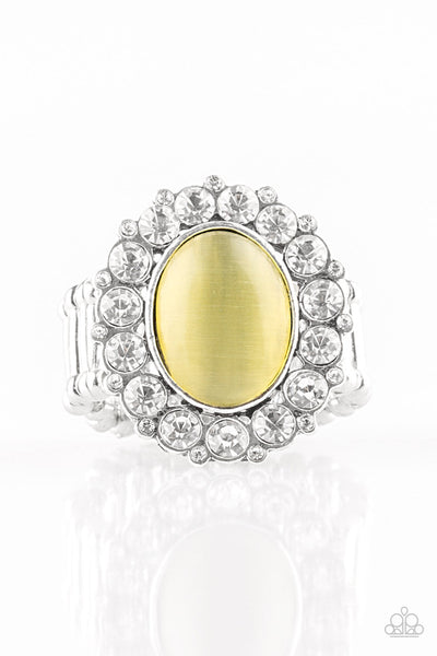 Glassy white rhinestones spin around a glowing yellow moonstone center, creating a whimsical floral frame atop the finger. Features a stretchy band for a flexible fit.