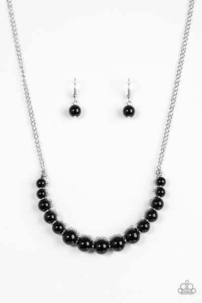 A classic strand of shiny black beads is threaded along an invisible string, creating a stationary pendant below the collar. Infused with shimmery silver accents, silver chain weaves atop the beads for a refined finish. Features an adjustable clasp closure.