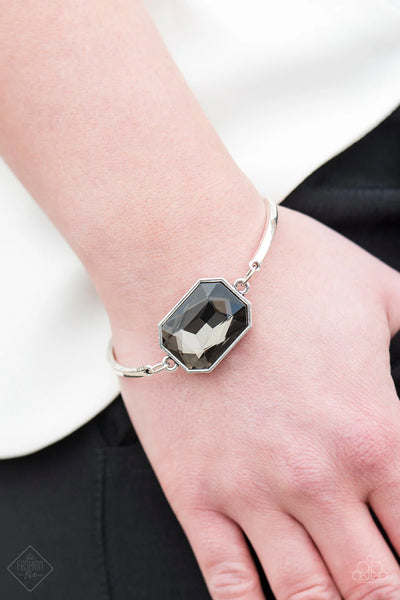 Featuring a regal emerald style cut, a smoky gem attaches to two arcing silver bars, creating a dramatic centerpiece atop the wrist. Features an adjustable clasp closure.